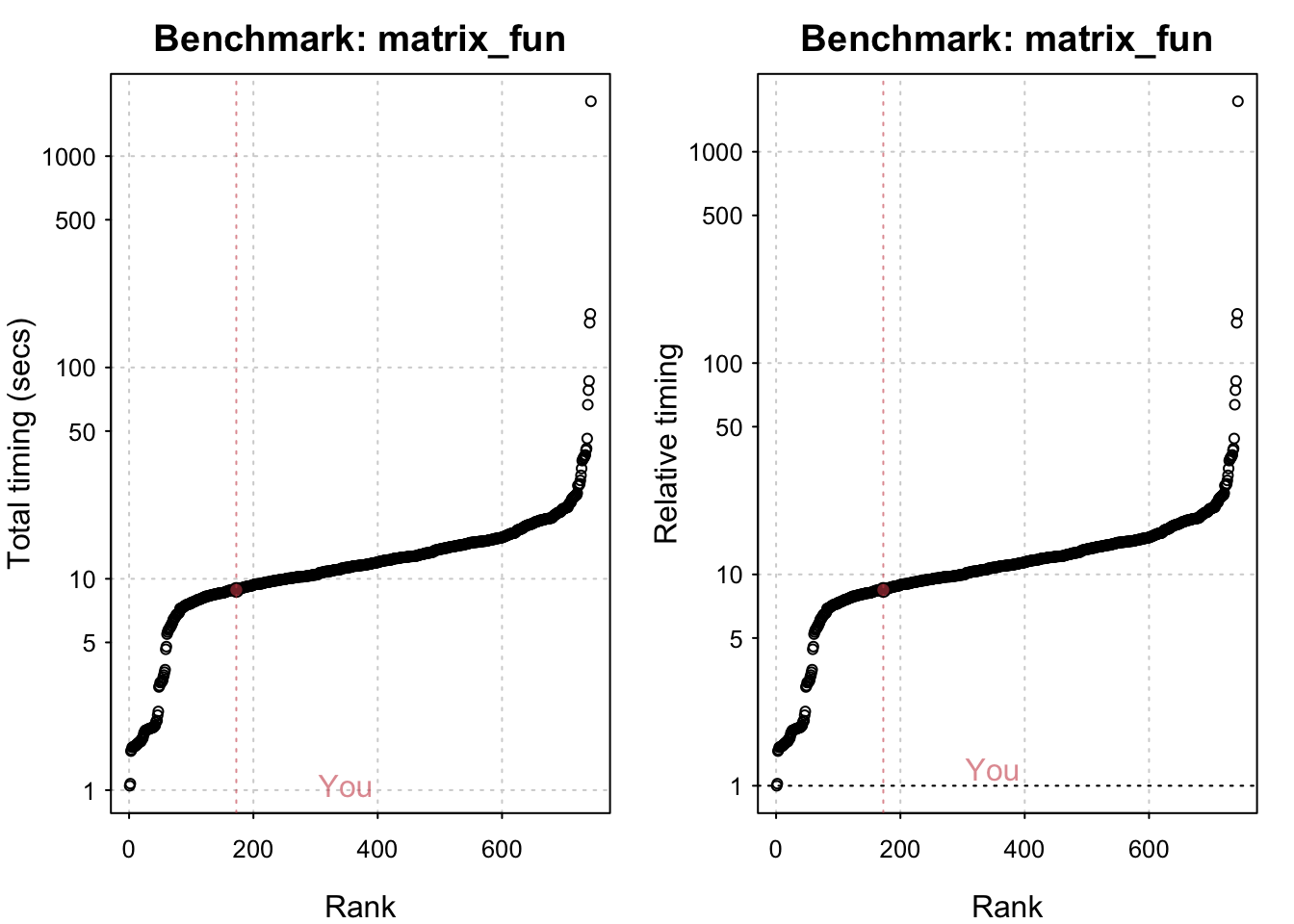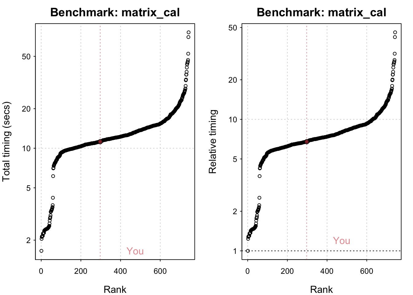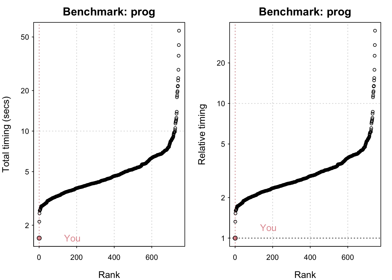 As aforementioned, the benchmarkme package provides a set of benchmarks to help quantify your system. More interestingly, it allows you to compare your timings with timings crowd-sourced on other systems.