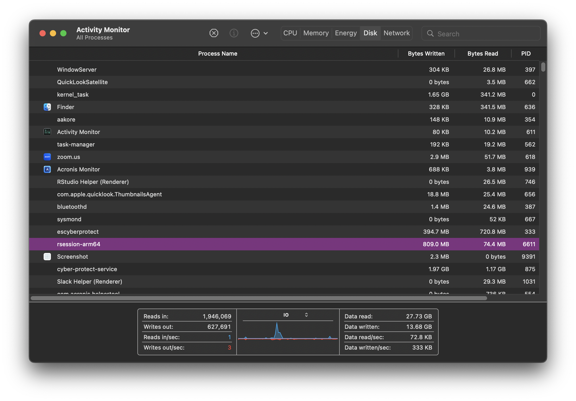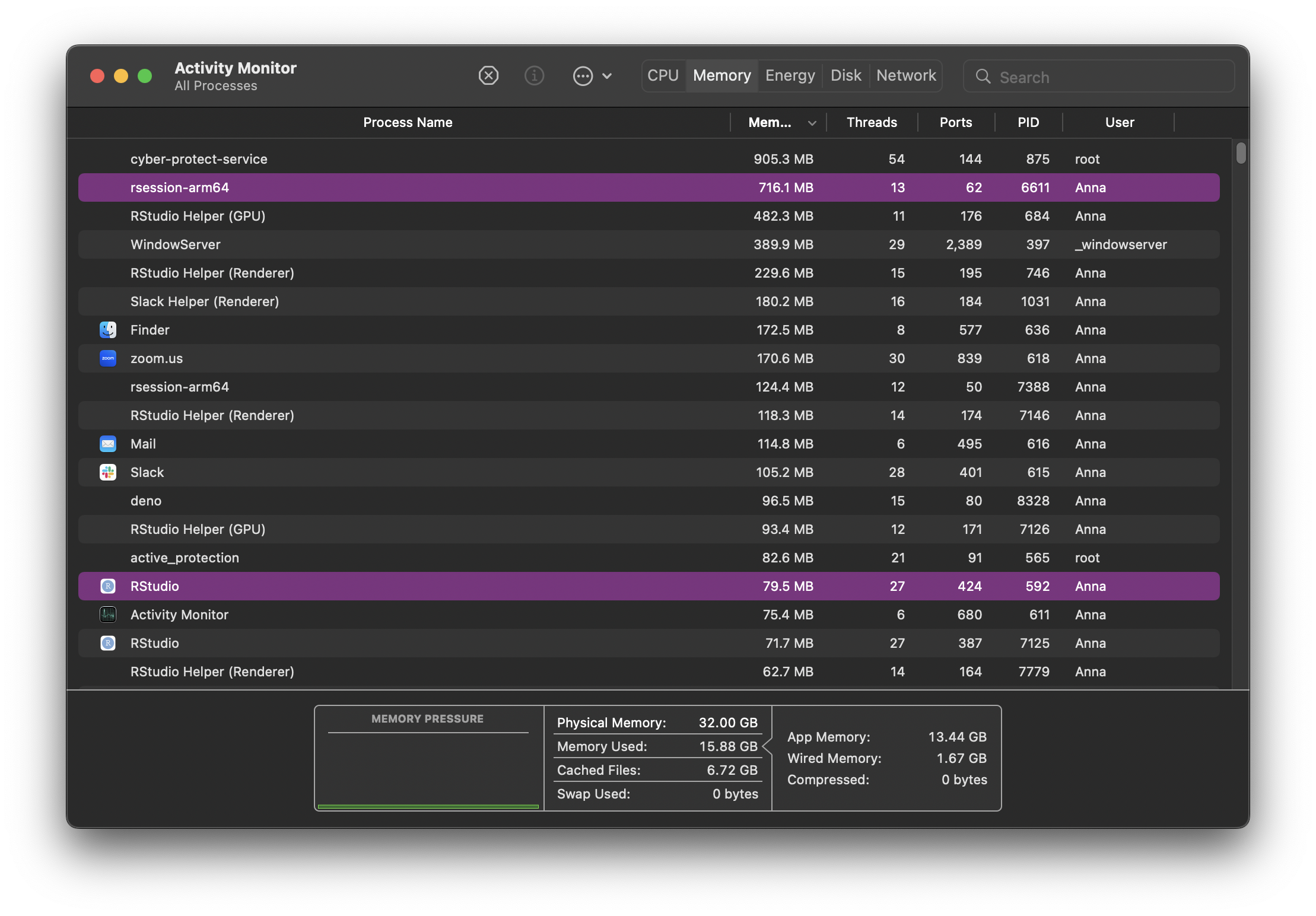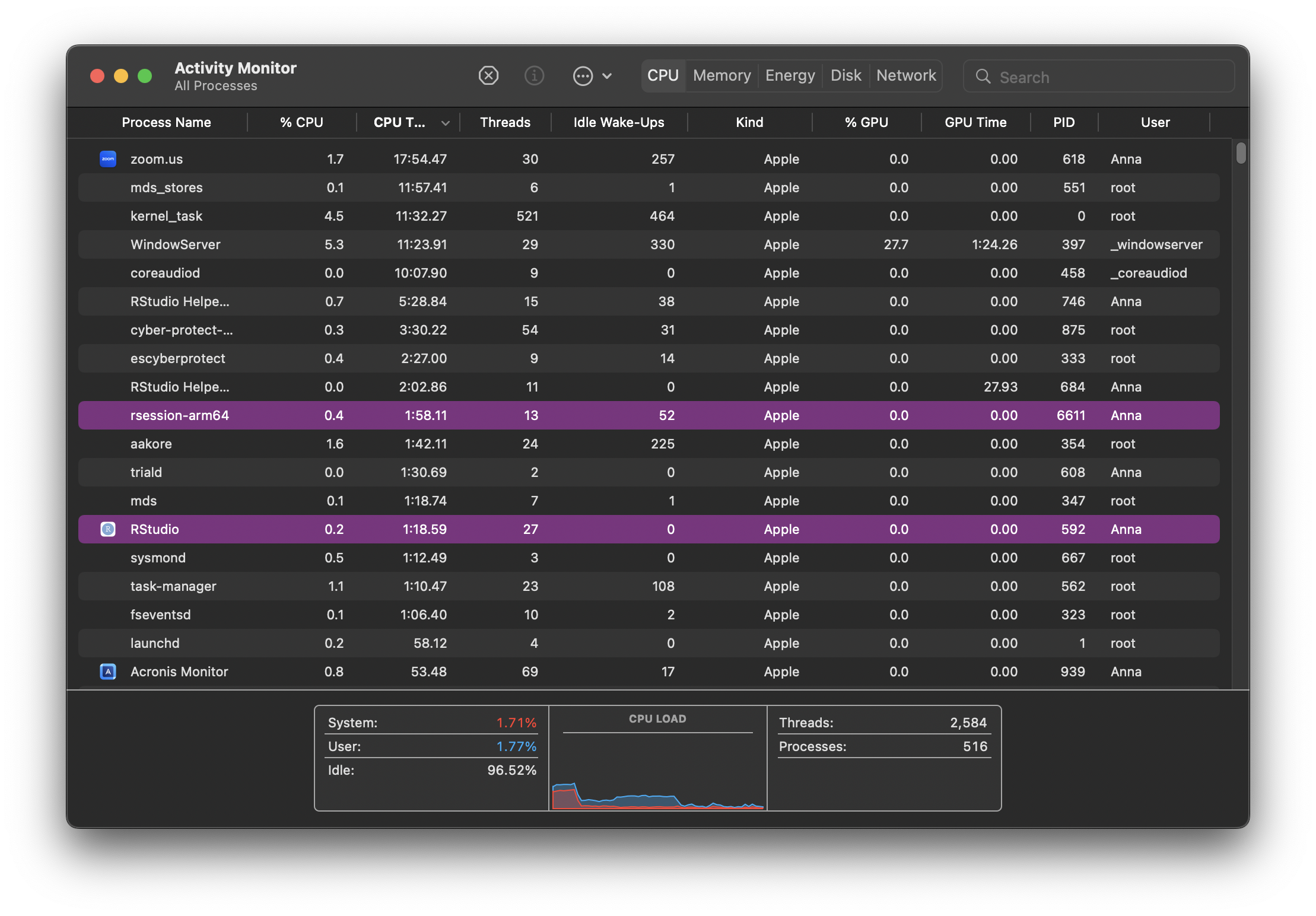 The rsession process moves to the top and, running in a single thread, uses ~100% of the available CPU while running. When finished, the process drops from the top and goes back to using just 0.2% of CPU as R waits for our next command.