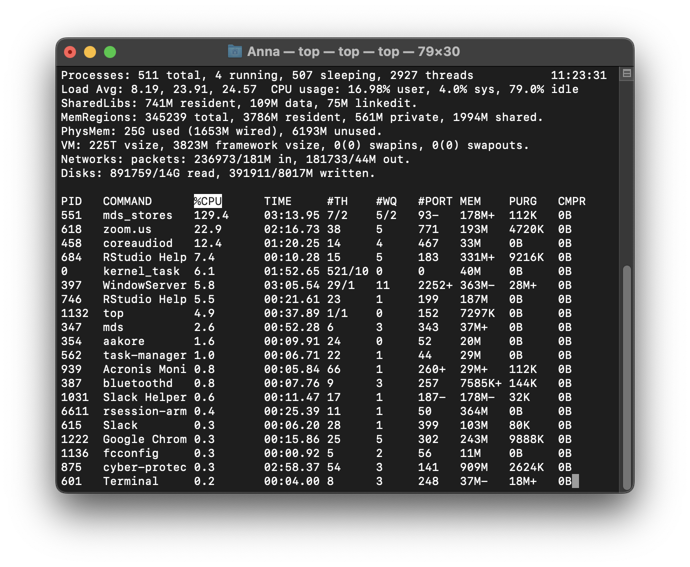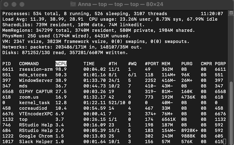 On macOS and Linux distributions, the top command can also be run in the terminal which initiates system monitoring in the terminal. top shows a summary of system activity as well as periodically displaying a list of processes on the system in sorted order. The default key for sorting is pid, but other keys can be used instead.