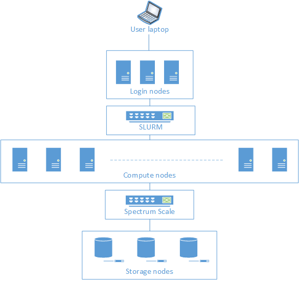 Storage nodes: a computer server that serves I/O request on behalf of the login and compute nodes. This is basically the equivalent of your local hard drive and is where all your data are stored. Storage nodes are connected to all compute nodes through Spectrum Scale which is a cluster file system that provides concurrent access to a single file system or set of file systems from multiple nodes.